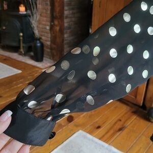 Gold & silver metallic polka dot sheer sleeves and breast pocket; satin sheen style body. Rounded hem button down. Light shoulder pads. Great for the holidays and parties!