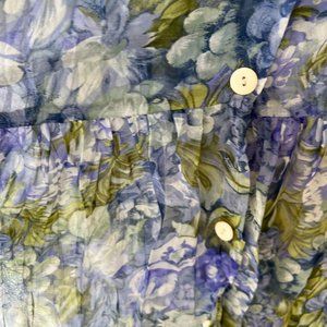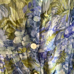 This is a really cute sheer flowered sundress. It has buttons down the front - 3/4 sleeve and gathered at a low waist.