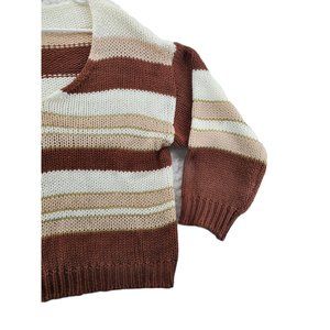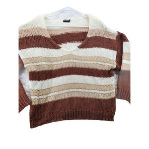 SHEILAY Sweater Women's L/S Striped Shaker Knit V-Neck Pullover Brown Large