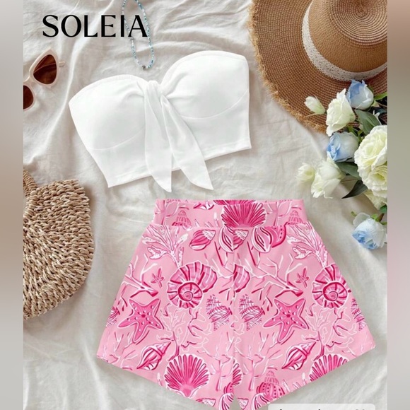 Size Small. Chic pink shorts with vibrant seashell design with white top. Ideal for beach days or casual wear. Worn ONCE. Perfect condition.