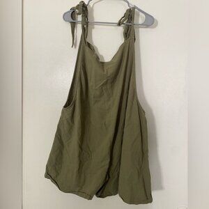 Army green color romper with tie/bow straps. Great condition, no noticeable flaws. 100% cotton, cute front pockets. Perfect for spring and summer. Can be dressed up or just for casual wear.