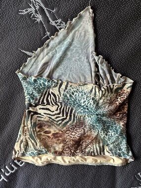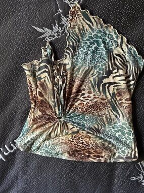 Twist-front camisole with mixed animal print. Lightweight, silky feel. Teal and brown tones for a bold look. Slim, flattering silhouette. Easy to pair with jeans or skirts.