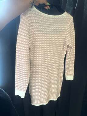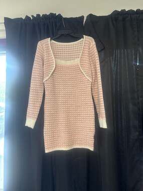 SHEIN Plaid Knit Bodycon Dress with Matching Shrug Set. This stylish 2-piece set features a pink and beige textured plaid pattern. The set includes a sleeveless bodycon mini dress with a square neckline and a coordinating long-sleeve bolero shrug. Perfect for transitional weather or a coquette-style aesthetic. The knit material provides a comfortable, figure-hugging fit. Excellent pre-owned condition with no visible signs of wear, snags, or stains.