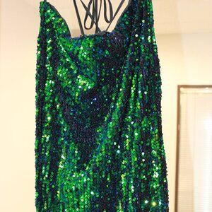 Selling the dress in my profile pic. This beautiful Backless Split Thigh Sequin Cami Dress Women's Sparkly Draped Neck Side Slit Hem Fancy Spaghetti Strap Summer Dress Green Velvet Sequin Midi Dress. The only damage is a couple of loose threading in the ties (please see picture).