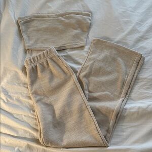 Stylish ribbed two-piece set. Includes strapless top and matching pants. Comfortable and chic.
