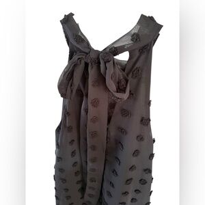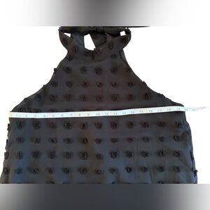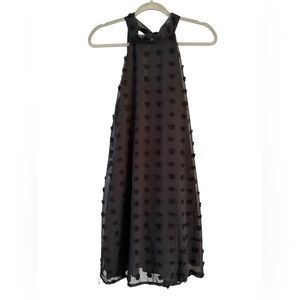 Elegant black, Swiss dot, dress. Features a tie at the neck. Perfect for evening wear.