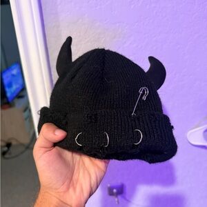 Edgy black beanie featuring devil horns and metal ring accents. Ideal for a bold look.