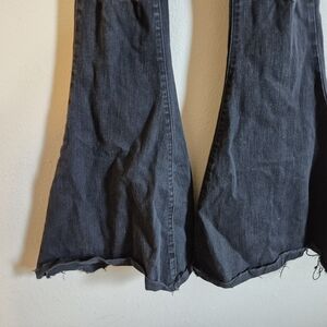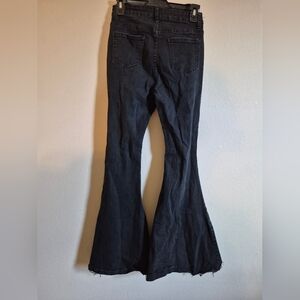 Trendy black flare jeans featuring stylish distressed accents. Ideal for a chic look.