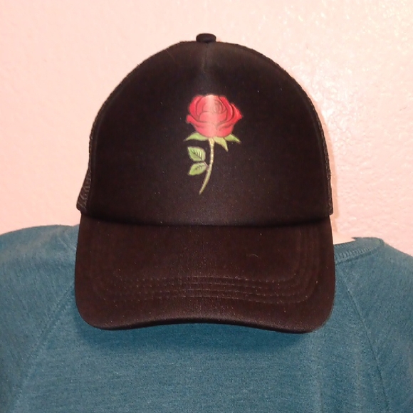 SHEIN Black Hat with Red Rose Embroidery