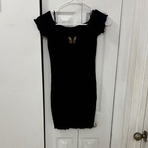 Chic black mini dress with a gold butterfly design. Perfect for stylish outings.