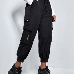 Elevate your wardrobe with SHEIN's black track pants, designed for ultimate comfort and style. These pants feature a relaxed fit with a high-waisted design and elastic ankle cuffs, perfect for any occasion. Made from a lightweight material, they offer a versatile look that seamlessly transitions from casual to semi-dressy settings.