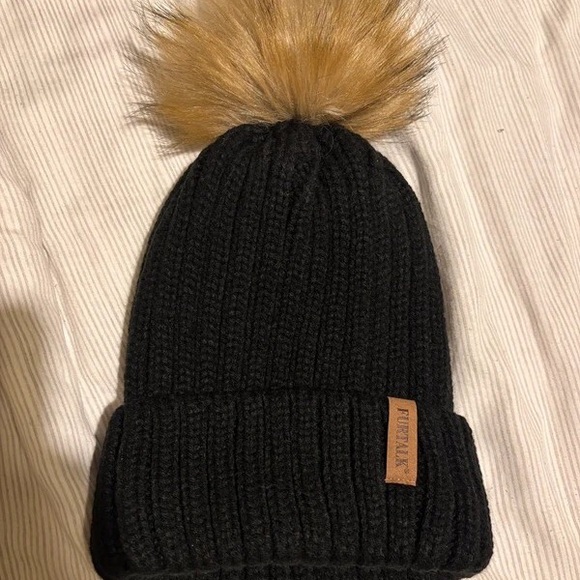 SHEIN Black Ribbed Hat with Tan Pom-Pom