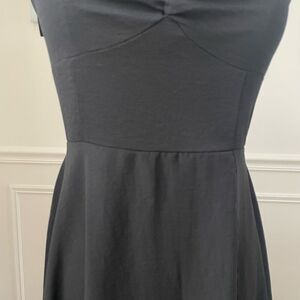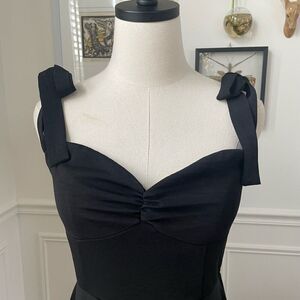SHEIN black midi length dress with Sweetheart neckline and smocked back for flexibility in fit. The wide straps tie at the shoulder and are adjustable. Offset front vent for easy movement. Tag size medium or six. Laying flat measure 16 inches armpit to armpit, 14 inches straight across the waist and 49 inches shoulder to hem