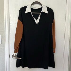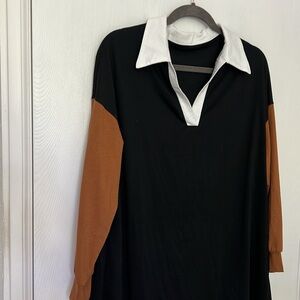 Stylish mini dress with contrasting brown sleeves. Features a white collar. Perfect for casual outings.