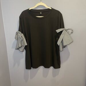 This stylish SHEIN blouse features a boxy silhouette with a playful tie front design. The black and white gingham accents on the short sleeves add a touch of elegance to the top. Perfect for a chic and casual look.