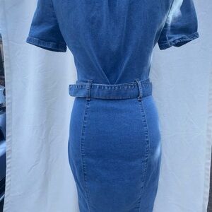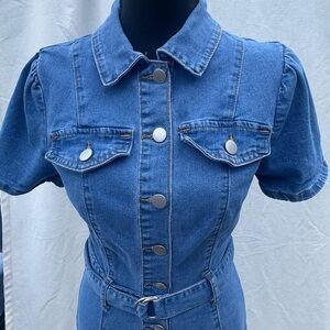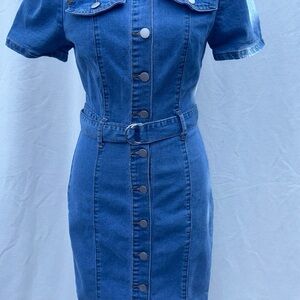 Chic denim dress with button-up front, collared neck. Short sleeves and belted waist. Perfect for casual outings.