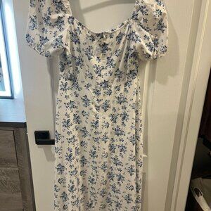 Charming maxi dress with blue floral print. Features short sleeves and tie detail. Ideal for casual outings.