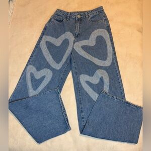 Chic blue jeans with heart designs. Flare and wide leg style.