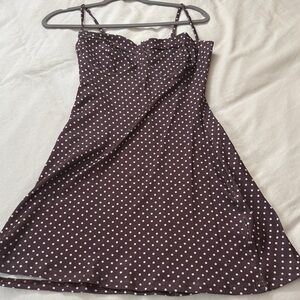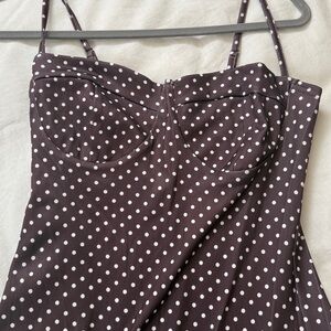 Chic brown mini dress with white polka dots. Spaghetti straps. Perfect for casual outings.