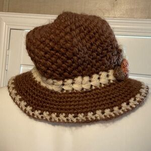 Stylish crochet hat. Features brown and cream colors. Perfect for casual wear.