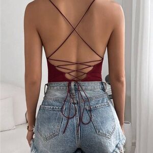 Elegant burgundy bodysuit. Strappy backless design. Perfect for casual outings.