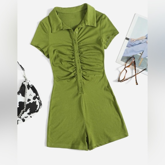 SHEIN Button Placket Ruched Front Rib-knit Solid Romper