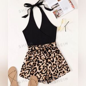 🔴SHEIN Cheetah Print& Black S:M Shorts romper stretch hugs the right curves EUC