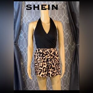 SHEIN Cheetah Print& Black S:M Shorts Romper stretchy hugs the right curvy spots gently used looks brand new! Measurements in photos