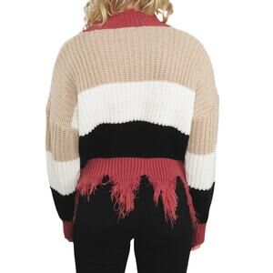 Shein Color Block Raw Cut Sweater with Tassels. V-Neck Chunky Knit Sweater with Blush Pink, Cream Beige, and Black Striped Detail. Raw Hem with Tassel Fringe. Super Cute Punk Sweatshirt. Major Euphoria Vibes