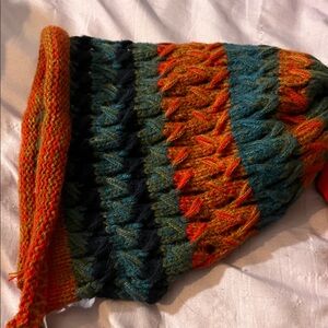 Vibrant knit hat featuring red, orange, and blue stripes with tassels.