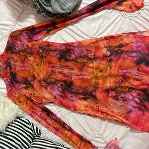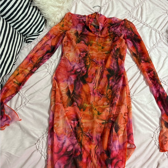 Bold dress with a mix of orange and pink. Perfect for making a statement.