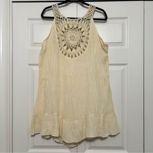 This elegant cream sleeveless cover-up features a delicate crochet design, perfect for a stylish and comfortable look at the beach or pool.