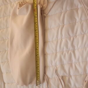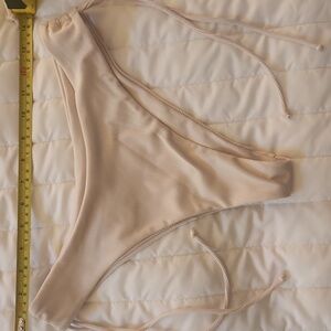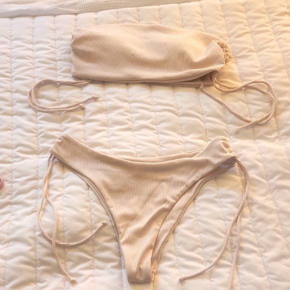 Stylish cream bikini with ribbed texture. Features bandeau top and cheeky bottoms. Ideal for beach days.