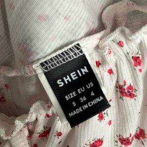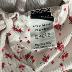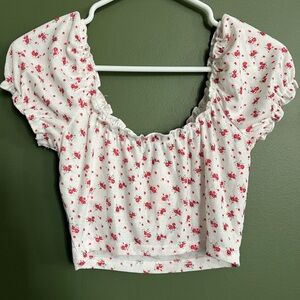 Chic blouse with red floral design. Features a ruched neckline and short sleeves. Perfect for everyday style.