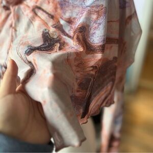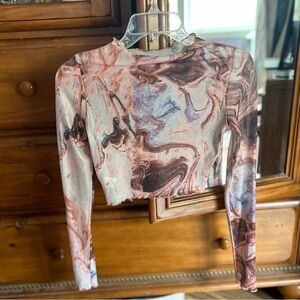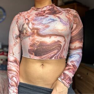 Multicolor marble print with lettuce trim. It’s long sleeve, very see through and has a good stretch to it! This is an extra small but honestly it’s could stretch to a medium. I’m clearly built like a football player so this shirt doesn’t suit me the way I’d like it to.