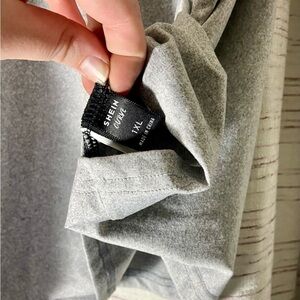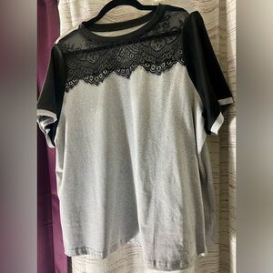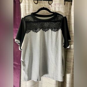 This stylish top from SHEIN features a striking black lace overlay on a soft gray fabric, creating an elegant and versatile look. The short sleeves and embellished design make it perfect for both casual and dressy occasions.