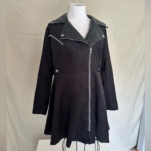 Edgy and chic black rocker style jacket from SHEIN Curve in size 0XL. Body of jacket is a faux suede black manmade material that is very soft to the touch. The jacket is lined at neck, collar and front sides with a black faux leather material. Full zip front in silver hardware. Decorative belt at the waist. Decorative zipper pocket at the front right above breast. Fit and flare style. Long sleeves. Wide collar/lapels. The material does not have much stretch to it, 95% polyester 5% elastane. Very good used condition.
