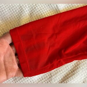 Stylish red long sleeve bodysuit with unique design. Snap closure.