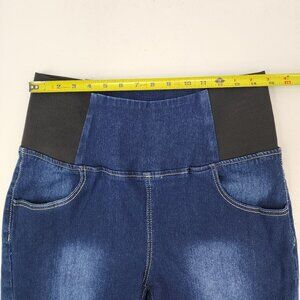 High waist, pull on style, stretch blue jean shorts, functional front & back pockets
