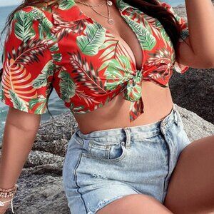 DETAILS: SHEIN Curve Womens Tropical Print Knot Front Crop Blouse 2X Beachy Summer NWOT.
