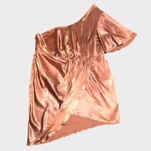 Sexy one shoulder wrap style dress with flattering flutter sleeve and elastic waist for easy fit. Gathered waistline. Stretch satin material.