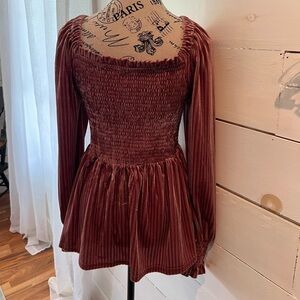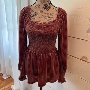 This vibrant dusty rose pink velvet top from SHEIN features a smocked bodice and a flattering peplum waist, adding a touch of elegance to any outfit. The long sleeves and ruched details enhance its stylish appeal, making it a versatile choice for various occasions. Excellent preowned condition, size medium, and from a smoke-free home.