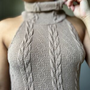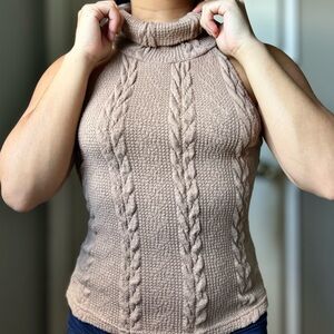 Beige cable knit tank sweater top. Super cozy and chic. High neck with a sleeveless design making it easy to layer under jackets or cardigans. Perfect for versatility as the seasons change.