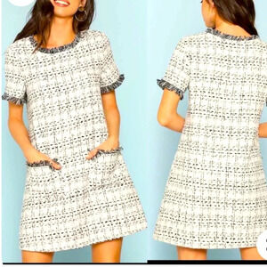 Shein grey White with black Frayed Edge Pocket Front Tweed Mini Dress Size M NWOT