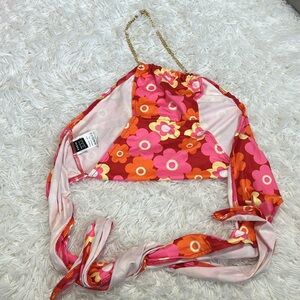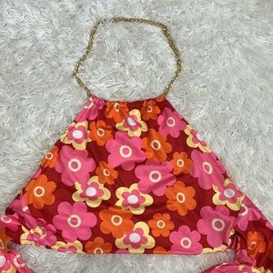 Bright and fun floral halter top with a stylish gold chain strap. Perfect for adding a pop of color to any outfit. Would be great for concert or festival.
