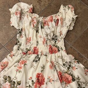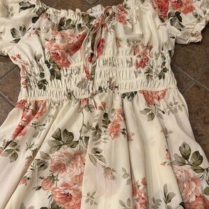 Chic off-shoulder mini dress with floral pattern. Features pink and cream tones. Ideal for any occasion! You can dress it up with wedges or dress down with cute sneakers! The dress has lots of stretch and no zippers! Never Worn!