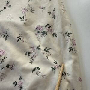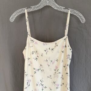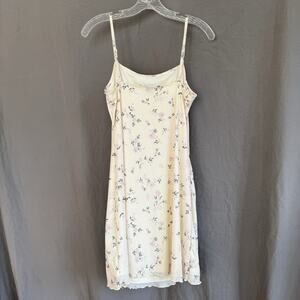 Soft warm cream or light butter yellow floral slip dress with pink and green ditsy print, adjustable straps, and lettuce-edge hem. Lightweight and stretchy with a soft knit lining for comfort. One tiny stain on side (see photo), not noticeable when worn and hasn't been stain-treated, so may come out. A cute pick for summer outings, layering over tees, or pairing with boots for a Y2K throwback.