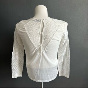 FEATURES: Women’s white tee with lace long sleeves and lace detailing on the back with button closure.