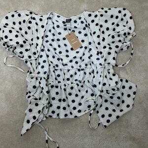 NWT! SHEIN Frenchy Polka Dot Print Tie Front Short Puff Sleeve Blouse Sz M