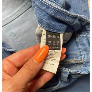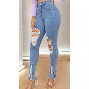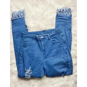 SHEIN size medium, high-rise distressed skinny jeans with fringe/fraying at the ankles. Excellent condition, worn once.